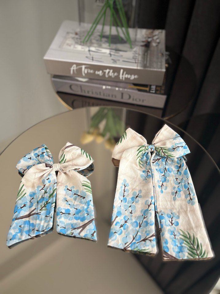 Mavi çiçek desenli, ipek dokulu fiyonk saç aksesuarları. Vintage, bohem ve retro tarzlara uygundur.
