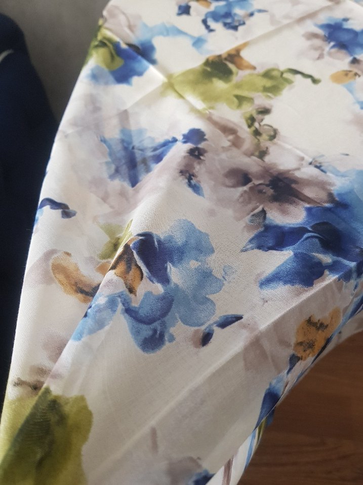 Hafif mavi çiçek desenli, yumuşak sentetik kumaştan yapılmış, drapeli ve çağdaş tarzda kadın baş örtüsü Bohem tarz için uygun.