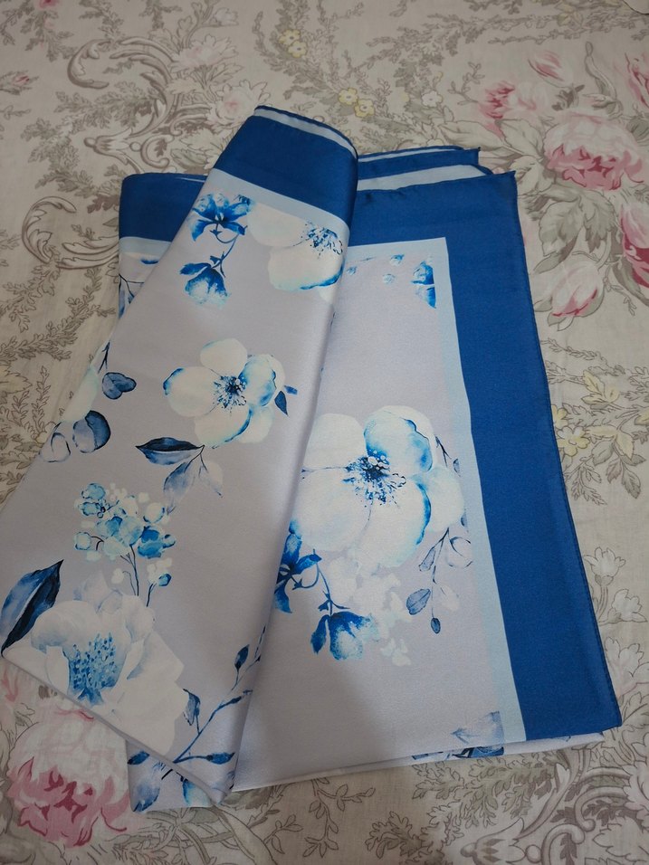 Yumuşak sentetik kumaştan, mavi ve gri çiçek desenli kadın şalı, geleneksel tarzda drapelenmiş, rahat bir görünüm sunar.