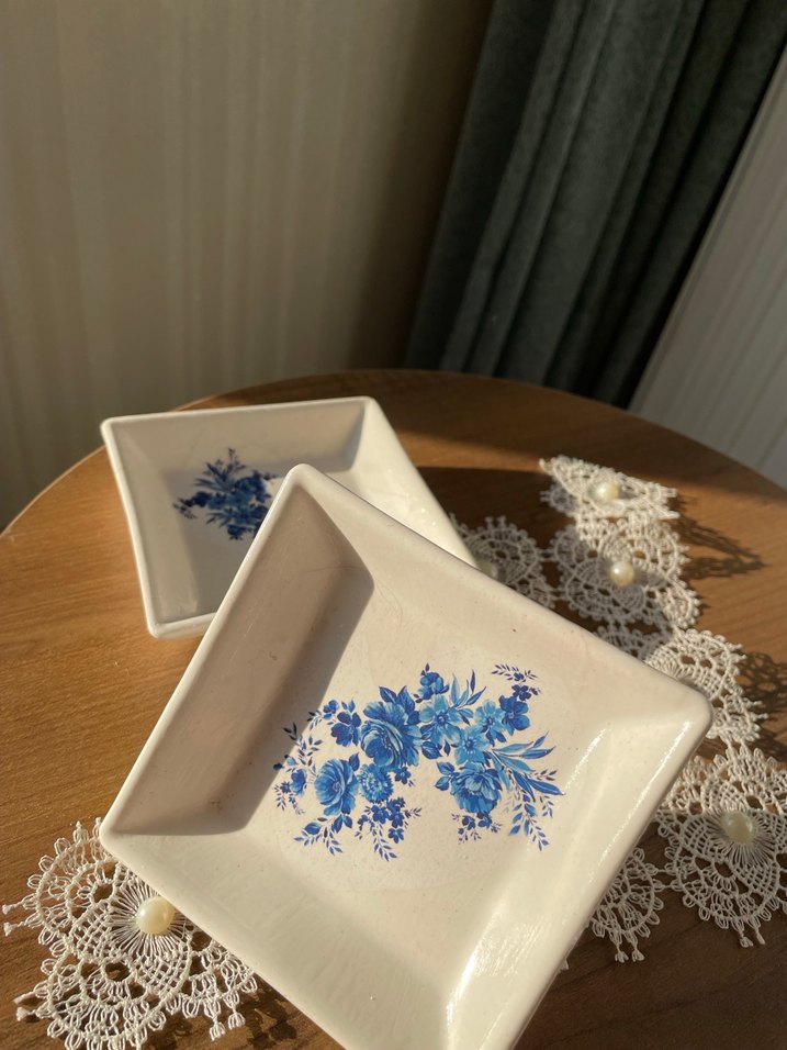 Hafif mavi çiçek desenli, geleneksel tarzda kare tabaklar. Pürüzsüz ve dayanıklı malzemeden yapılmıştır. ️Özel tasarımdır handmade tekli fiyatıdır