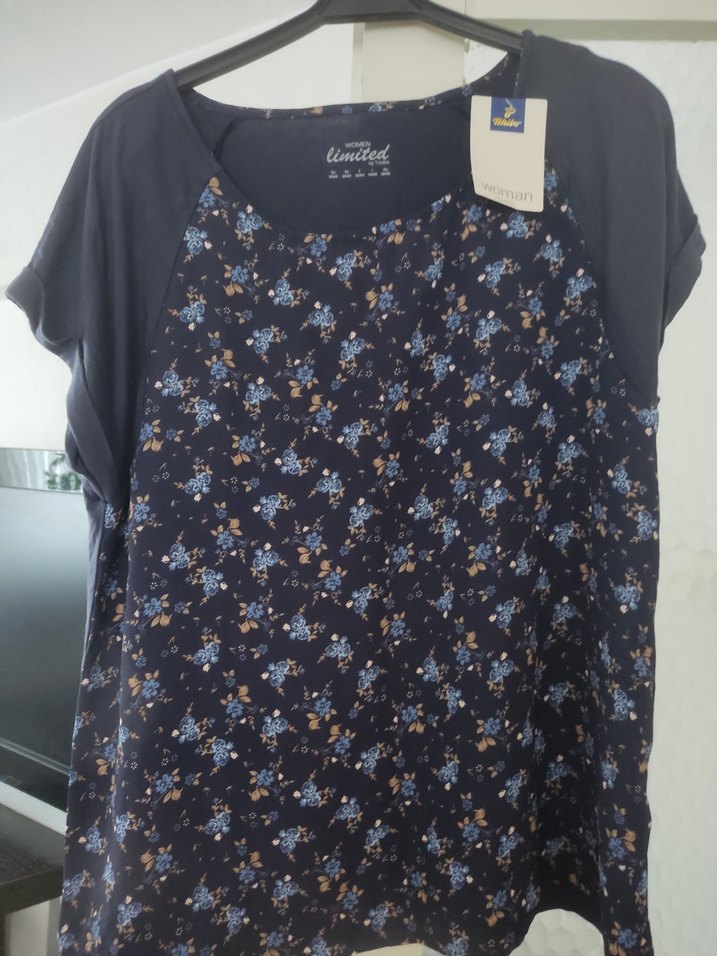 Pamuk kumaştan, kısa kollu, mavi çiçek desenli, rahat kesim ve yuvarlak yakalı kadın bluz. Günlük kullanıma uygun, sade ve şık tasarım