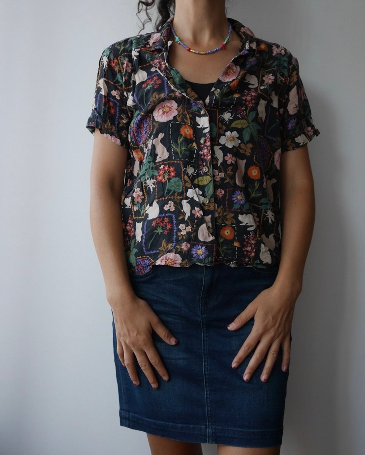 İnce, rahat viskoz kumaştan, yakalı ve düğmeli gömlek. Rahat kesimi ve canlı koyu çok renkli çiçek deseniyle günlük kullanıma uygundur. Fotoğraftaki modelin ölçüsü; 36 / S Beden 1,68 boy
