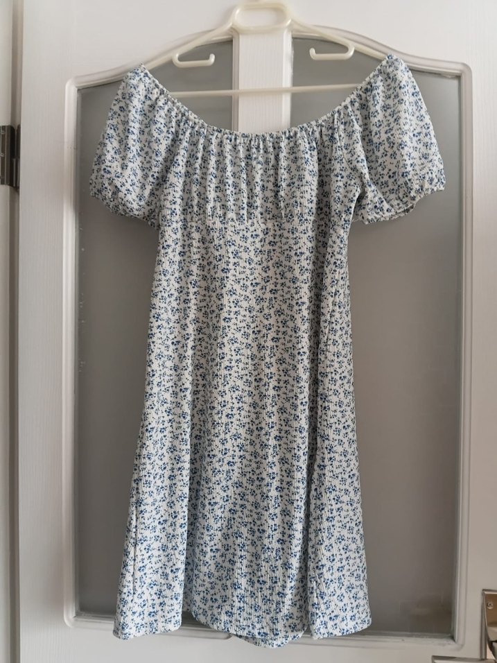 Mavi çiçek desenli, pamuk kumaştan yapılmış, düğmeli ve tekne yaka kısa bluz, bohem tarz için uygundur.
