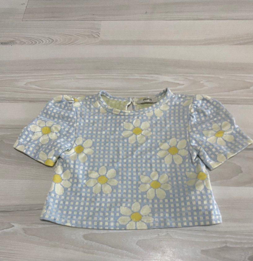 Mavi pastel renkte, beyaz ve sarı çiçek desenli, kısa kollu, yuvarlak yakalı, düğmeli ve bol kesim kız bluzu. 0 ürün 4- 5 yaş #panço#hm#koton#zara#lcw#