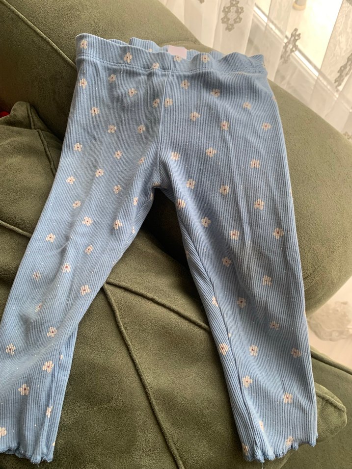 Mavi pastel renkte, çiçek desenli kız taytları. Yumuşak denim kumaştan, düğme detaylı, rahat ve şık bir görünüm sunar.