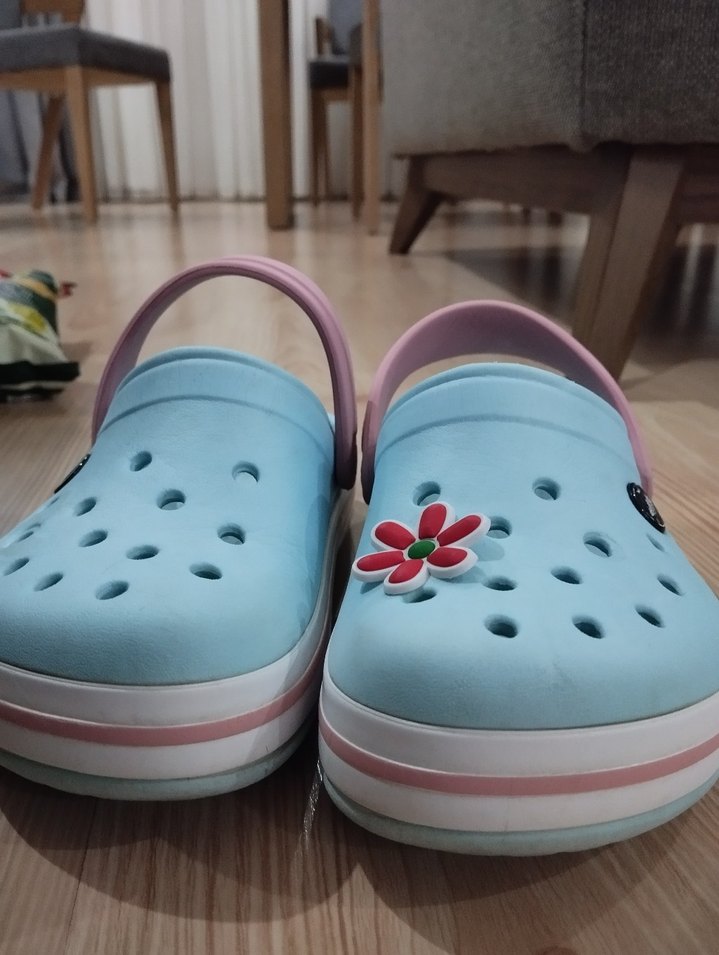 Pastel mavi renkte, tokalı ve çiçek desenli kız terliği. Rahat kauçuk malzemeden üretilmiştir, bohem ve retro tarzı için uygun.
