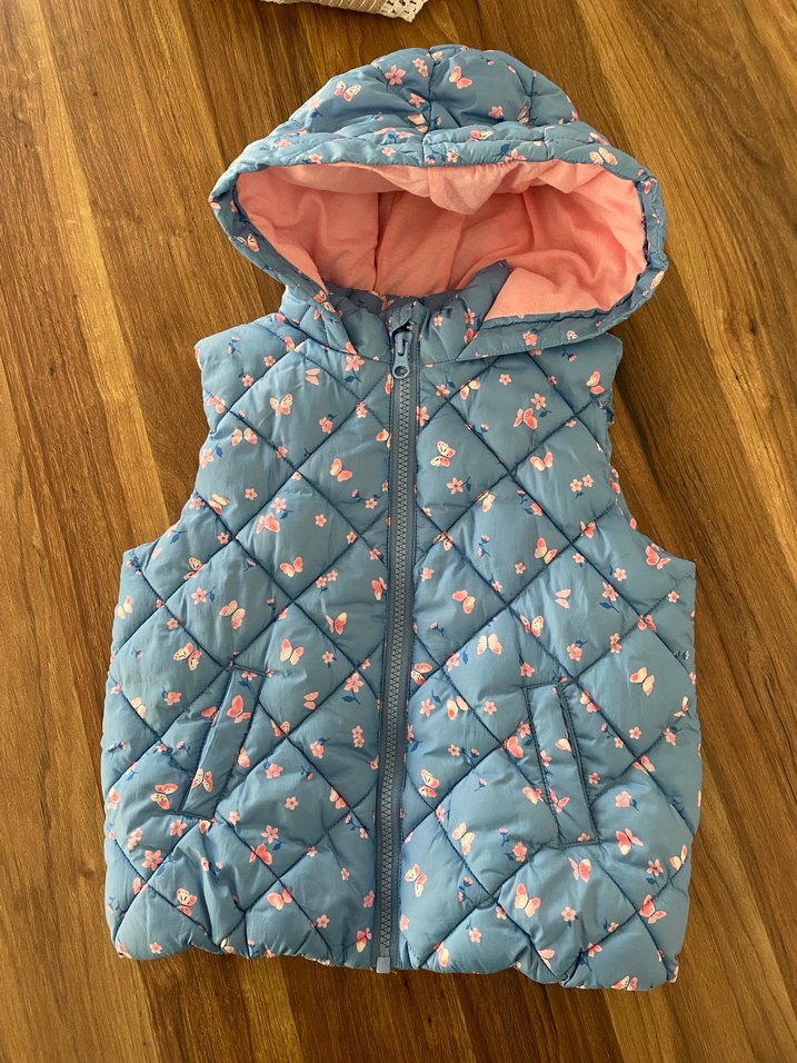 Mavi renkte, nakışlı çiçek desenli, kapüşonlu ve yumuşak iç astarlı kız yeleği. Fit kesimli ve kolsuz, rahat kullanıma uygun.