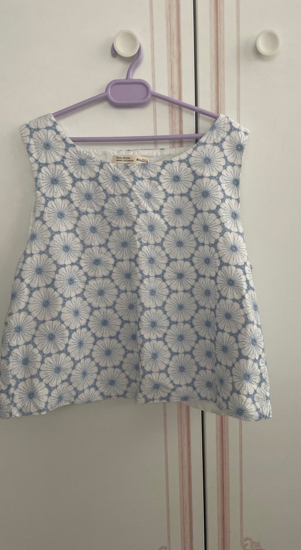 Mavi çiçek desenli, dantelli, kolsuz bluz. Salaş kesim ve midi boyda, vintage bohem tarzına uygun.