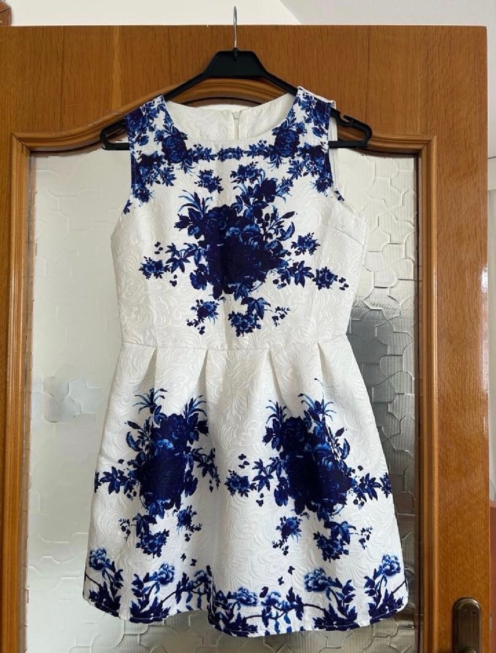 Kolsuz, beyaz kumaş üzerinde mavi çiçek desenli elbise. Fitted bel ve fırfır detayları ile klasik şıklık sunar. Sıfır ürün hiç giyilmedi. Boy 75 cm Bel 35 cm Kol altı 43 cm