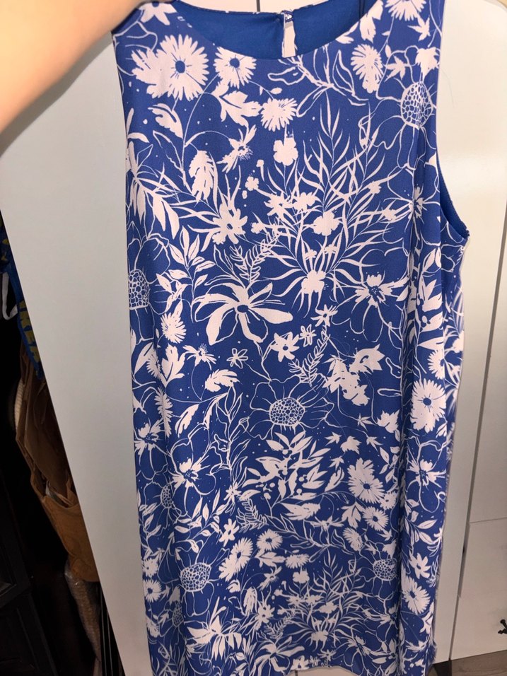 Mavi ve beyaz çiçek desenli, kolsuz ve askısız yakalı, bol kesim midi elbise, günlük kullanıma uygun.