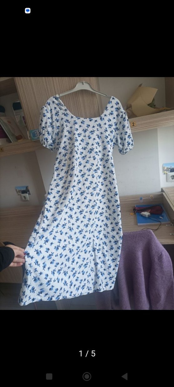 Pamuk kumaştan, mavi çiçek desenli, düğmeli ve kısa balon kollu bol kesim midi elbise. V yaka ve gündelik bohem tarzlara uygun.