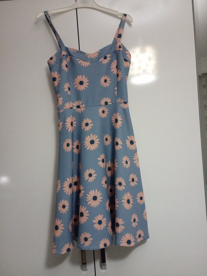 Mavi renkte, çiçek desenli ve pile detaylı, ince askılı ve kolsuz, belden oturan midi elbise. Rahat günlük kullanıma uygundur.