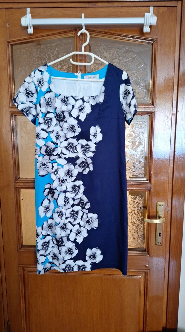 Kısa kollu, tekne yaka, koyu mavi taban üzerine beyaz çiçek desenli midi hamile elbisesi. Günlük kullanıma uygun, rahat kesim.