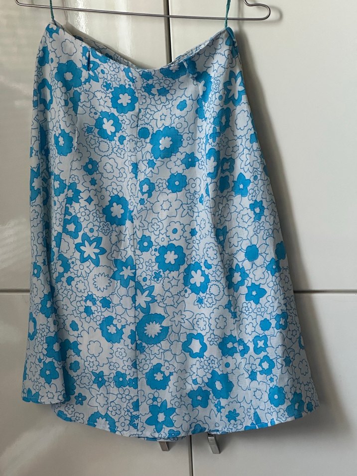 Mavi çiçek desenli, bol kesim midi eteği, drapeli tasarımıyla günlük kullanıma uygun vintage bohem tarzı.