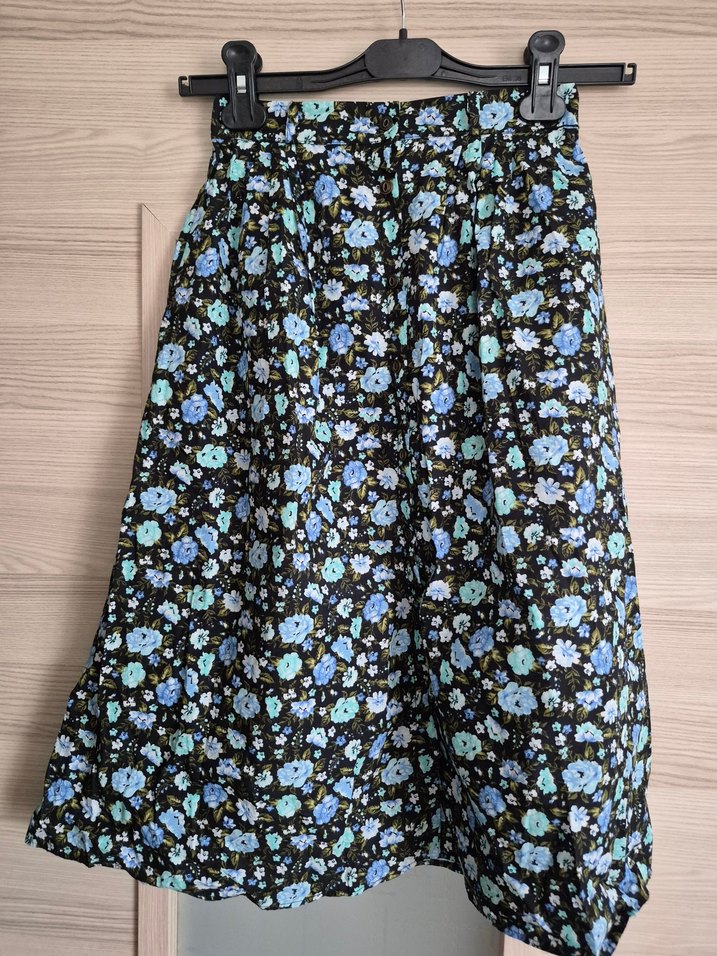 Koyu mavi renkli, dar kesim ve pile detaylı eteği. Çiçek desenli, midi boyda ve yumuşak sentetik kumaştan yapılmıştır. Bohem tarz için uygundur.