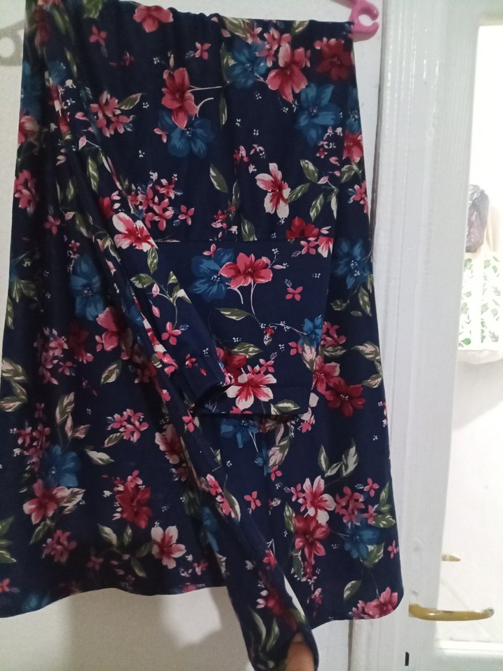 Mavi çiçek desenli, drapeli, bol kesim midi hamile eteği, günlük rahat kullanım için uygundur.