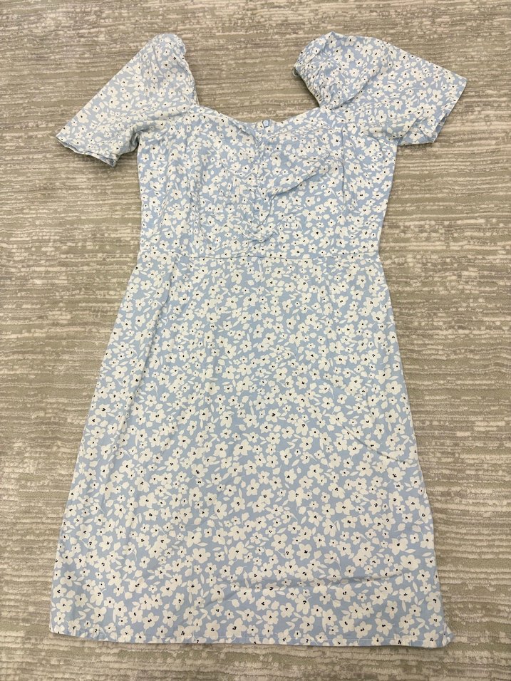 Pamuklu, mavi çiçek desenli, kısa balon kollu, düğmeli ve tekne yaka midi boy oturan elbisedir.