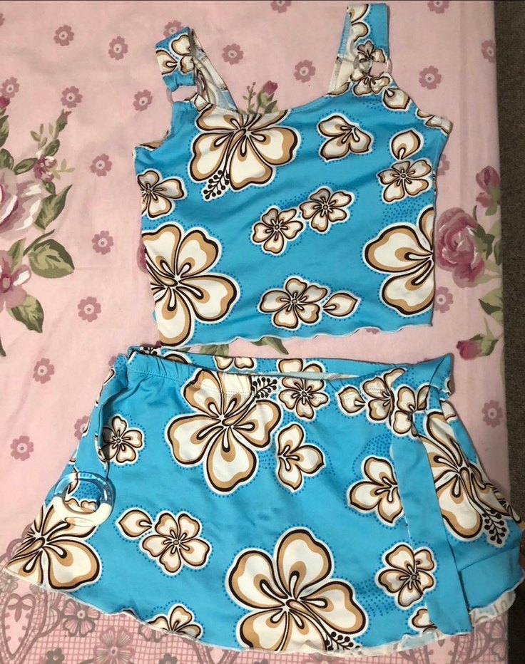 Mavi çiçek desenli, göğüs kısmında ki süngerleri ben çıkardım pek iyi değillerdi herhangi bir sütyen süngeri konulabilir ben öyle yapıyordum eteğinde bikinisi var onu çekmeyi unutmuşum yanında extra olarak bağlamalı bikini eteği yolluyorum onun da rengi mavi markasını falan bilmiyorum teyzem bana almıştı