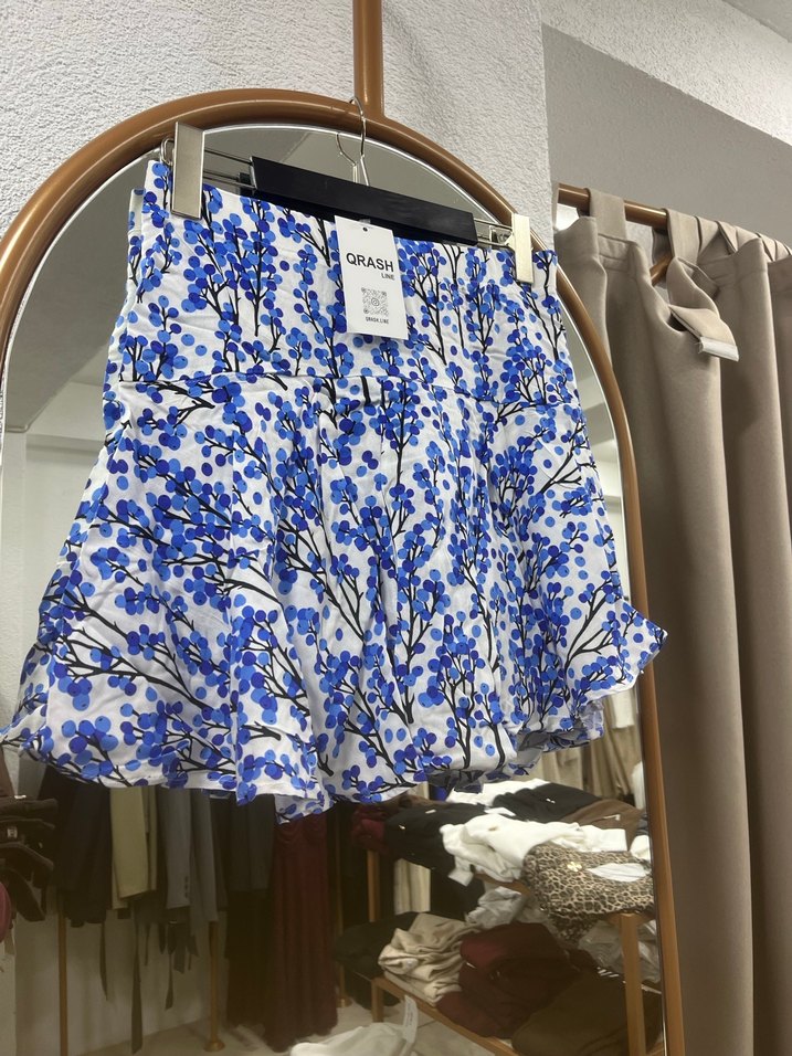 Mavi çiçek desenli, volanlı ve bol kesimli mini etek, rahat sokak stili için uygundur.