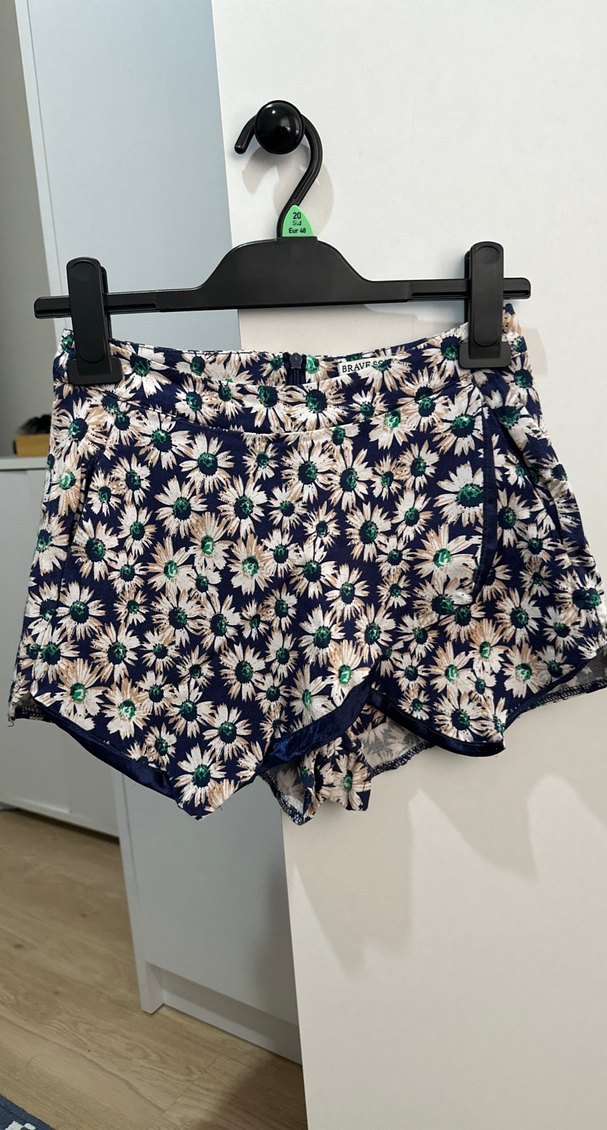 Mavi, koyu çiçek desenli, düğmeli mini şort. Yurtdışından aldım. Mini şort etek.