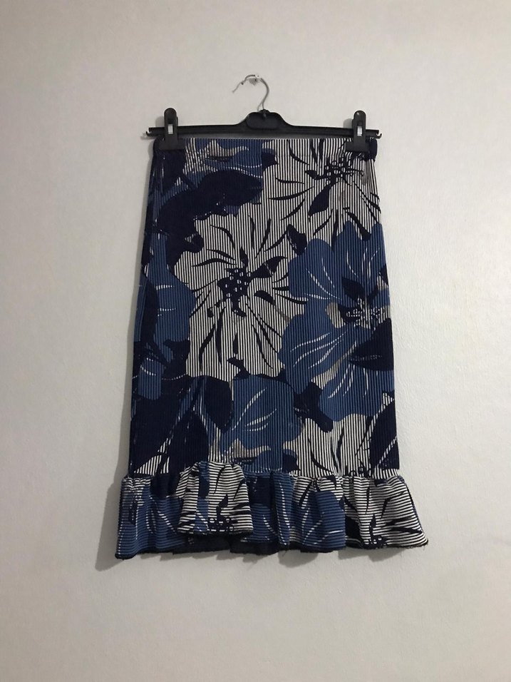 Mavi ve gri çiçek desenli, pilili ve dar kesim mini etek. Tekstil kumaştan yapılmış, günlük kullanıma uygun bohem tarzda.