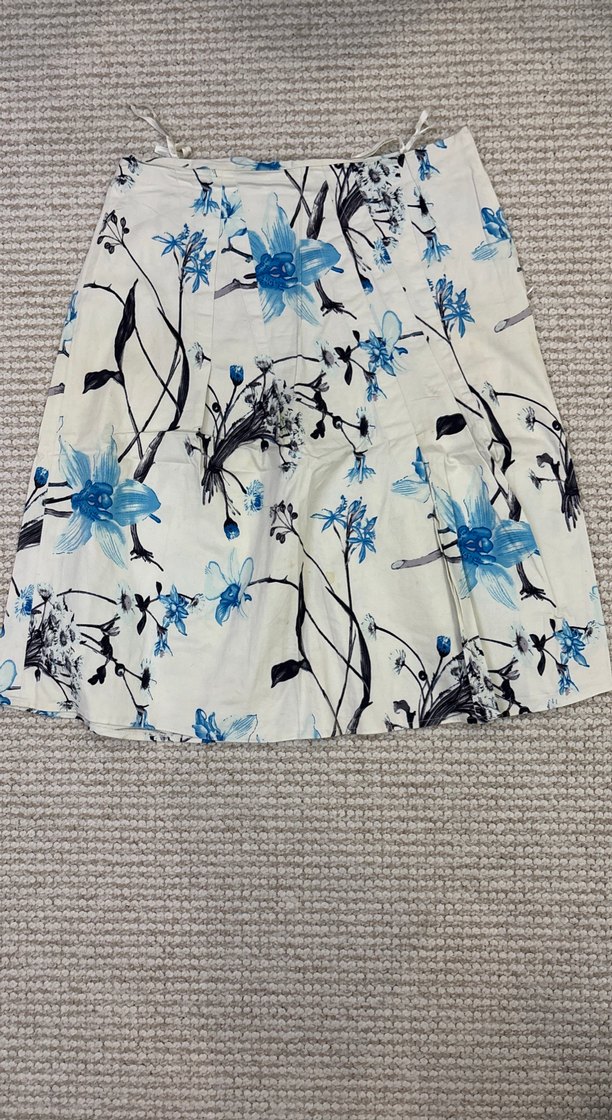 Bu bol kesim hamile eteği, piliseli tasarımı ve mavi çiçek desenleriyle dikkat çekiyor. Bohem tarzda, midi boy ve dış mekan kullanımı için uygundur. Fermuarlı