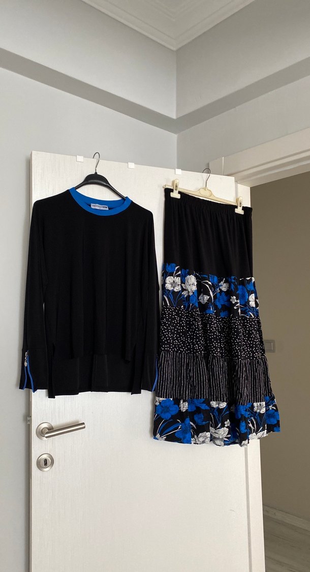 Mavi çiçek desenli, piliseli uzun ve bol kesim hamile eteği. Günlük kullanıma uygun, bohem tarzda rahat bir etek. Çok rahat triko tril tril etekli takım
