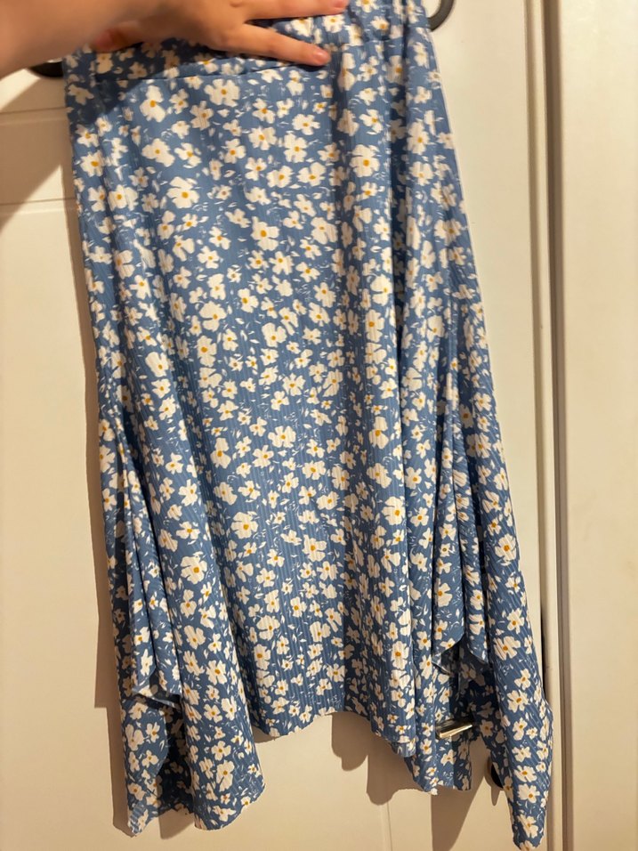 Mavi çiçek desenli, salaş kesim midi hamile eteği, dökümlü tasarıma sahip. Yumuşak sentetik kumaştan üretilmiştir, günlük kullanıma uygundur.