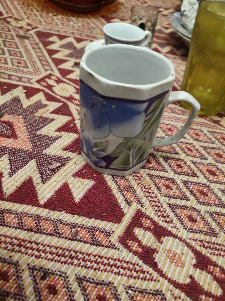 Canlı mavi çiçek ve yeşil yaprak desenli seramik kupa, sıcak içecekler için uygundur. ☕depo üründür temiz ve güzel şekilde teslim edilecektir.