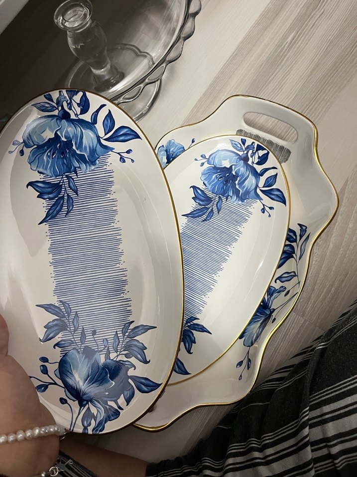 Altın detaylı, mavi çiçek desenli, kulplu seramik yemek tabakları seti. ️