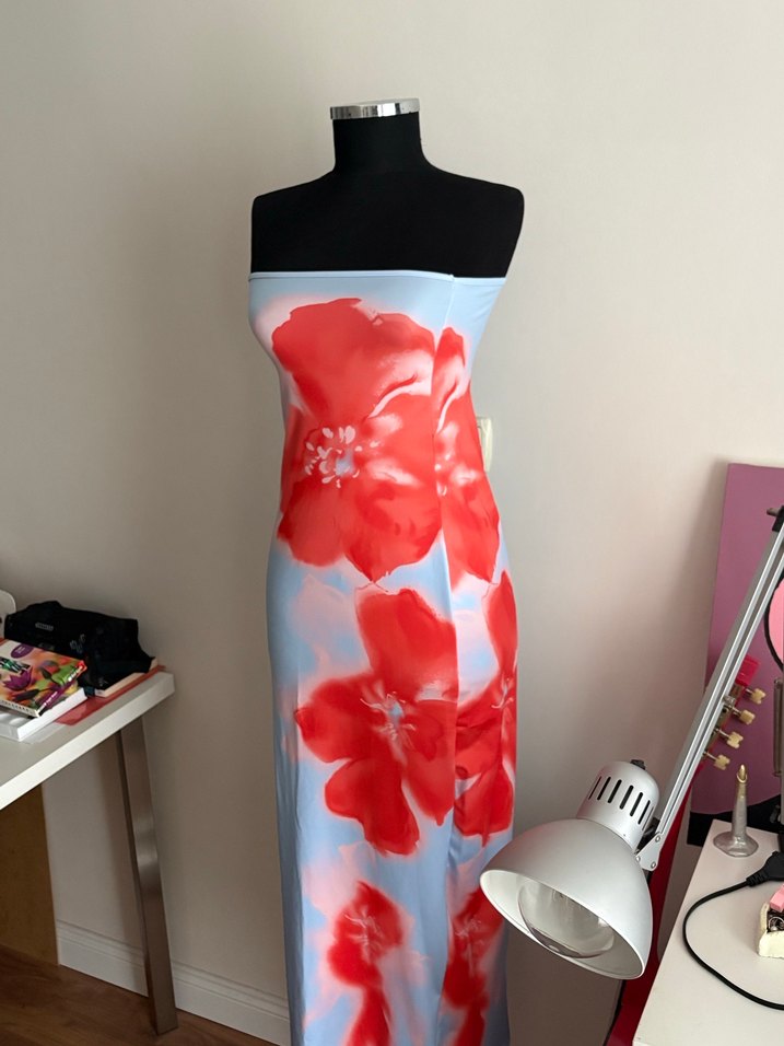 Mavi zemin üzerine büyük kırmızı çiçek desenleriyle straplez Dökümlü, regular fit ve uzun polyester kumaş