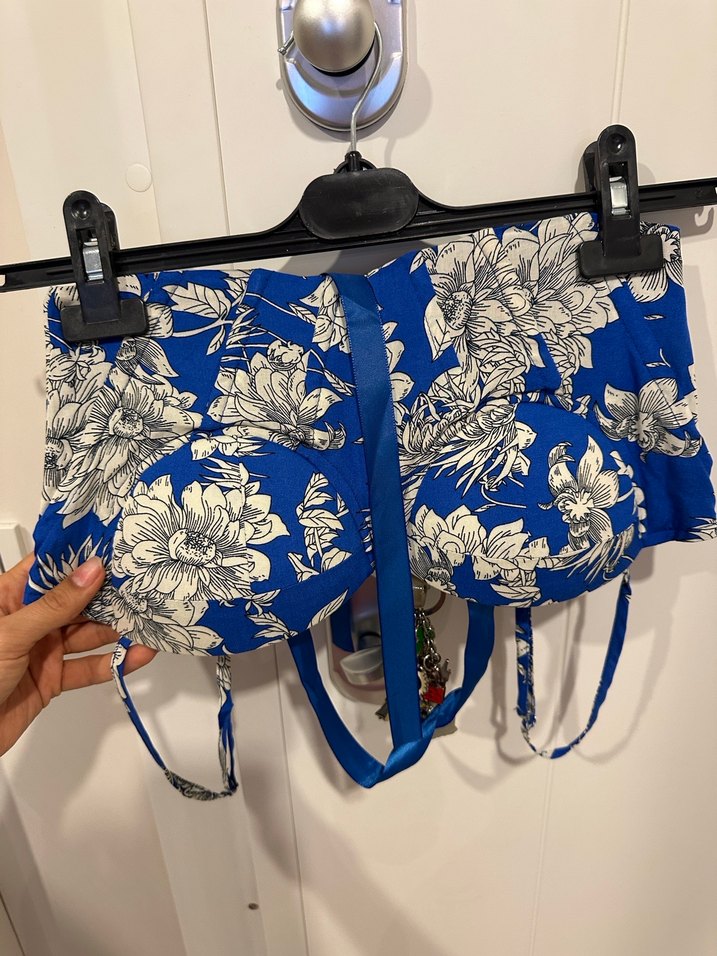 Dar kesim bustiyer, koyu mavi sentetik kumaş üzerine çiçek desenli ve tokalı detaylara sahip, bohem sokak stili için uygun.
