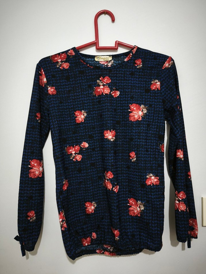 Kız çocuk için uzun kollu, yuvarlak yakalı, rahat kesim triko bluz. Koyu mavi zemin üzerine kırmızı çiçek desenli, günlük sokak stiline uygun.