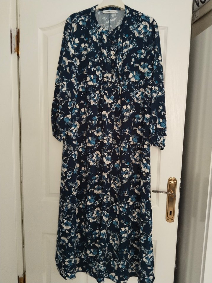 Uzun, bol kesim elbise, koyu mavi çiçek deseni, uzun kollu ve yuvarlak yaka ile günlük kullanım için bohem tarzda drapeli.
