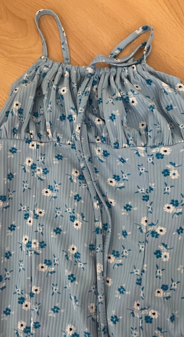 Mavi renkte, ince askılı ve pileli detaylara sahip, çiçek desenli uzun elbise. Sentetik kumaştan üretilmiş, günlük kullanım için uygun.