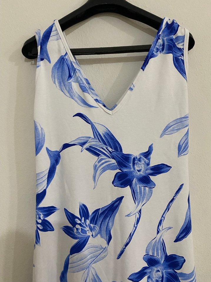 Askısız, kolsuz ve drapeli uzun boy elbise. Yumuşak rahat kumaş mavi çiçek desenli, minimalist bohem tarzd