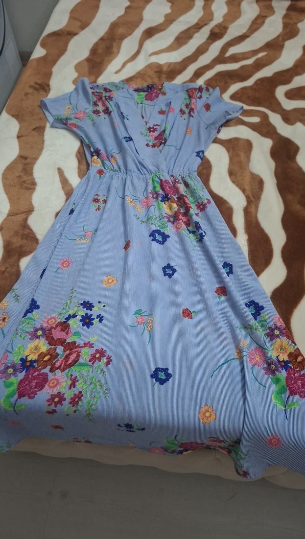 Çiçek desenli, kısa kollu, V yaka, uzun mavi elbise. Rahat bohem tarzı için drapeli ve bol kesim.