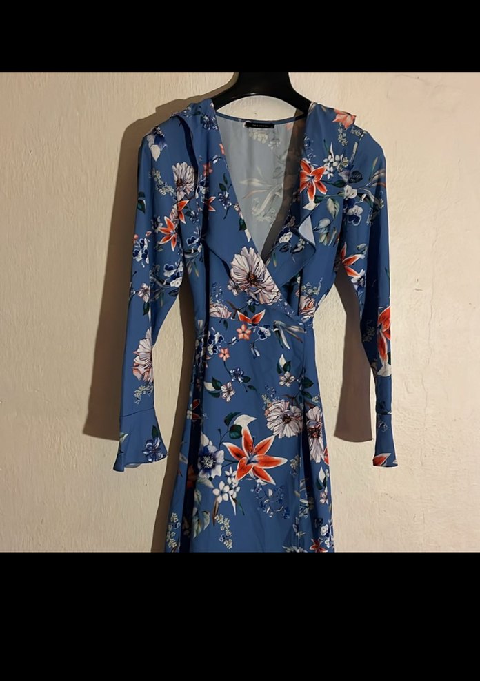 Mavi zemin üzerine çiçek desenli, uzun kollu ve vücuda oturan uzun bohem tarz elbisedir.