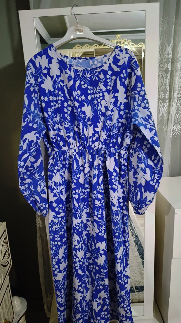Mavi renkli, çiçek desenli uzun elbise. Bol kesim, uzun kollu ve yuvarlak yakalıdır. Bohem tarzda, dökümlü tasarıma sahiptir.