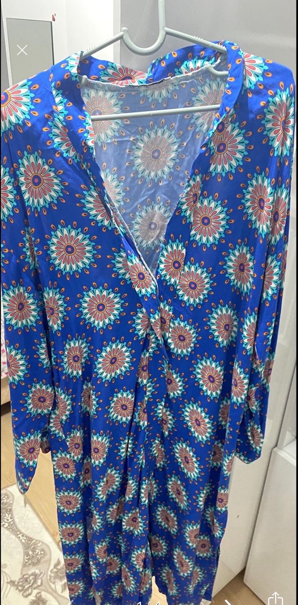 Mavi renkte, çiçek desenli uzun bohem elbise. V yaka, uzun kollu, düğmeli ve bol kesimdir. Yumuşak sentetik kumaştan yapılmıştır.