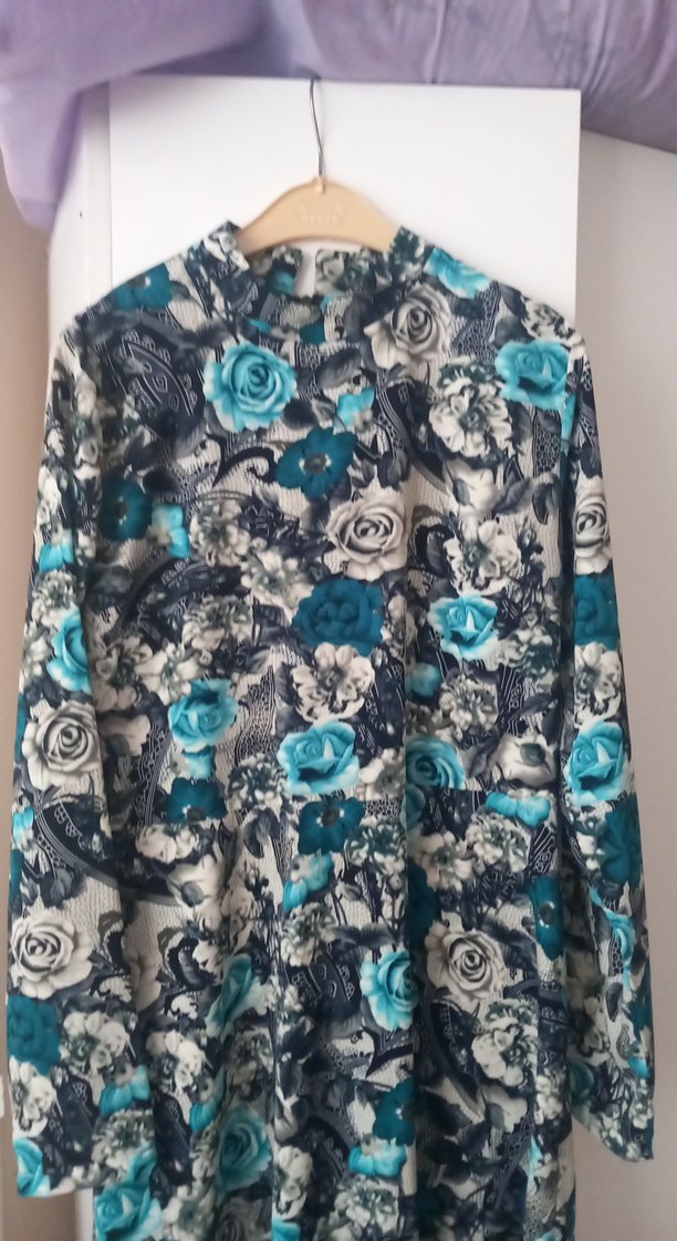 Yüksek yakalı, düğmeli uzun ve bol kesim elbise. Yumuşak sentetik kumaştan üretilmiş, mavi ve gri tonlarda vintage çiçek desenli bohem tarzda. boy 137 iki kol arası 46