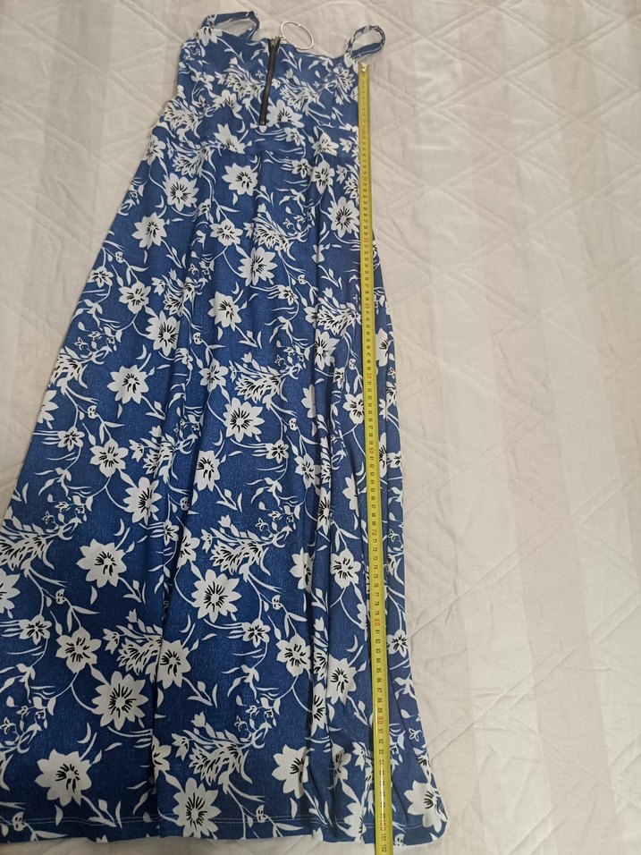 Mavi uzun elbise, ince askılı ve V yaka tasarıma sahiptir. Fermuarlı ön kısmı ve çiçek desenleriyle bohem tarzı yansıtır. Giyildiğinde çok zarif ve zayıf gösteriyor. Astarsızdır ama iç göstermez. Yinede taytla kullandım ben .