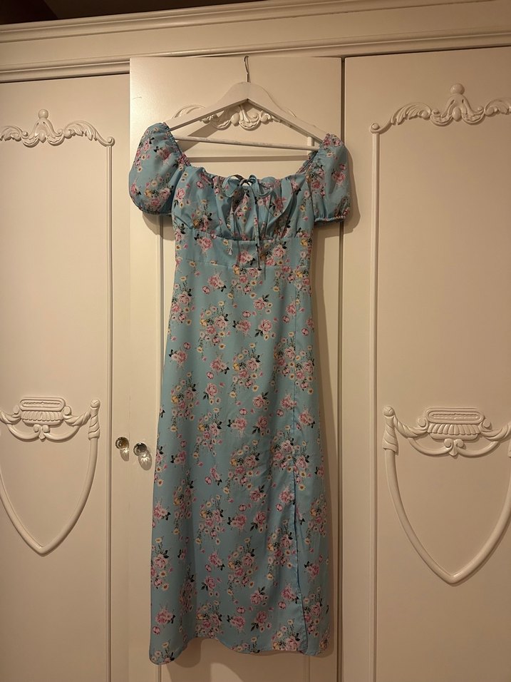 Pamuk hissi veren sentetik kumaştan yapılmış, kısa kabarık kollu ve straplez yakalı, mavi çiçek desenli uzun bol kesim elbisedir. Romantik akşamlar için uygundur.