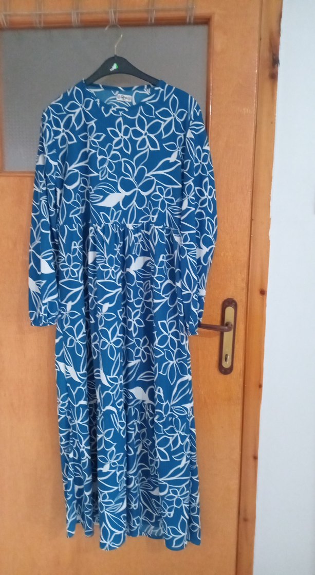 Uzun, bol kesim mavi çiçek desenli elbise, uzun kollu ve yuvarlak yakalıdır. Drapeli ve bohem tarzda, yumuşak sentetik kumaştan, günlük şık kullanıma uygundur. iki yerde çok belli olmayan leke var onun dışında sorun yok biraz giyildi xl yazıyor ama 38 bedene olur