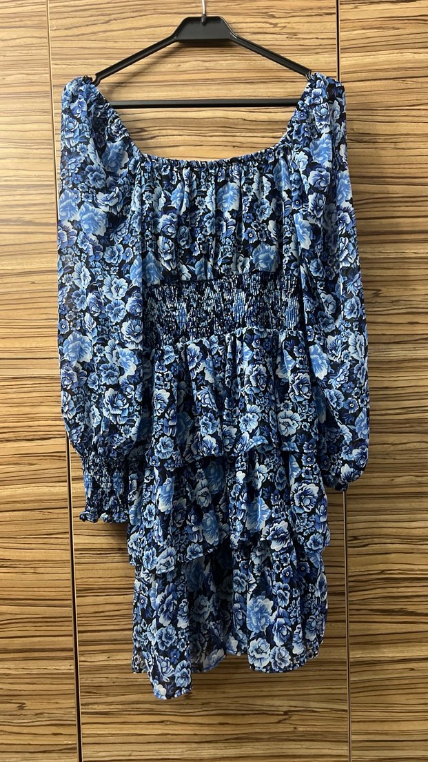 Mavi renkli, uzun kollu, bol kesim ve fırfırlı detaylara sahip, sentetik kumaştan bohem tarzda. Dış mekan kullanımı için uygundur.