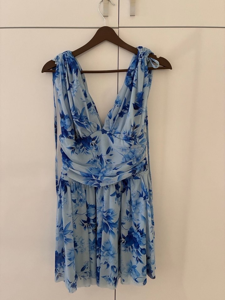 Kolsuz, halter yaka ve beli drapeli trendyol milla elbise. Mavi tie-dye çiçek deseni ve yumuşak kumaş ile bohem tarzı sunar. 1 kere giyildi. Çok iyi durumda.