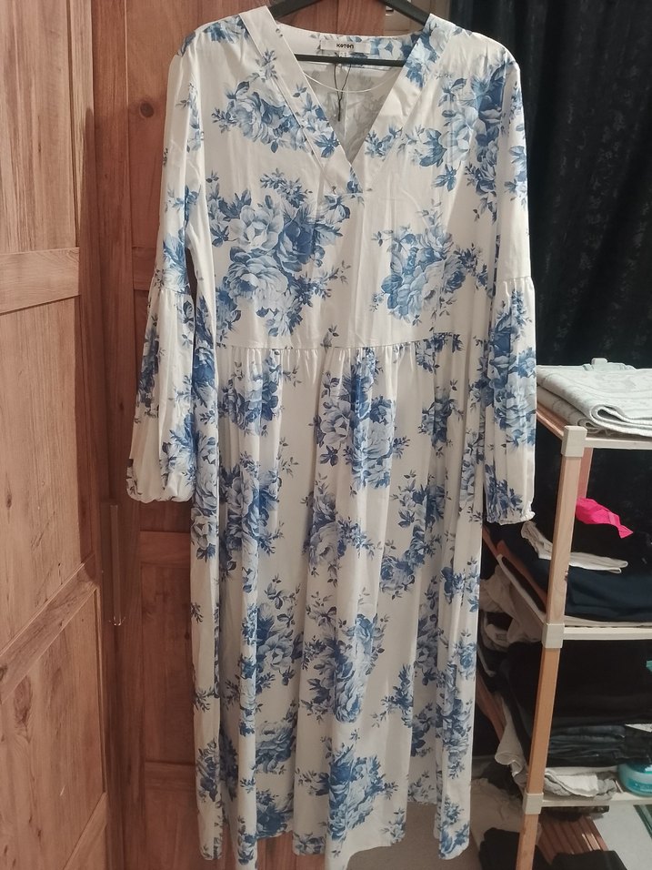 Pamuk kumaştan, mavi çiçek desenli, pilili ve uzun kollu, V yakalı bol kesim uzun kadın elbisesi. Günlük kullanım için uygundur.