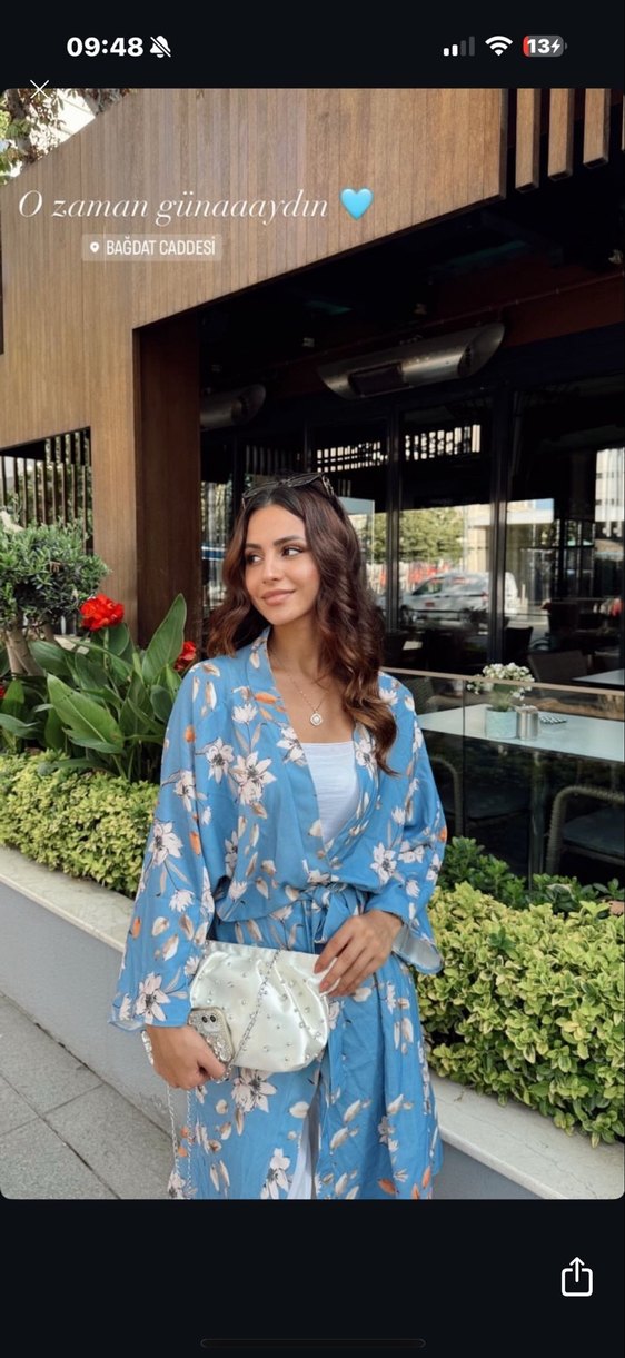 Mavi Çiçek Desenli Uzun Kadın Kimono