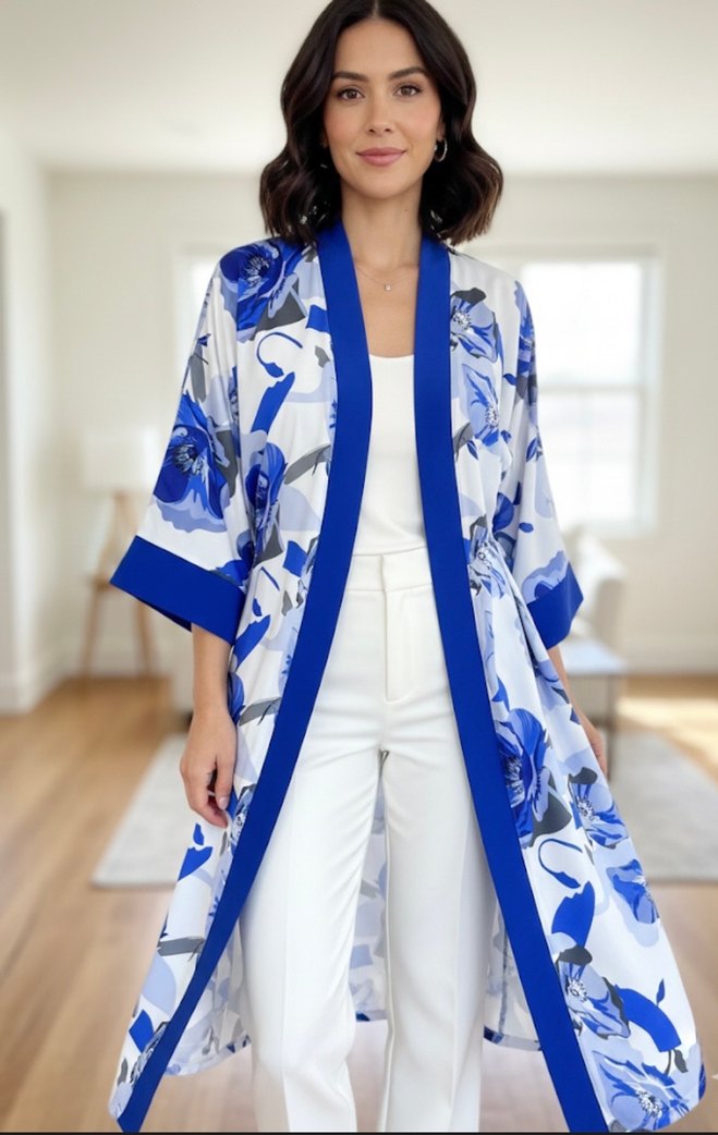 Mavi Çiçek Desenli Uzun Kadın Kimono