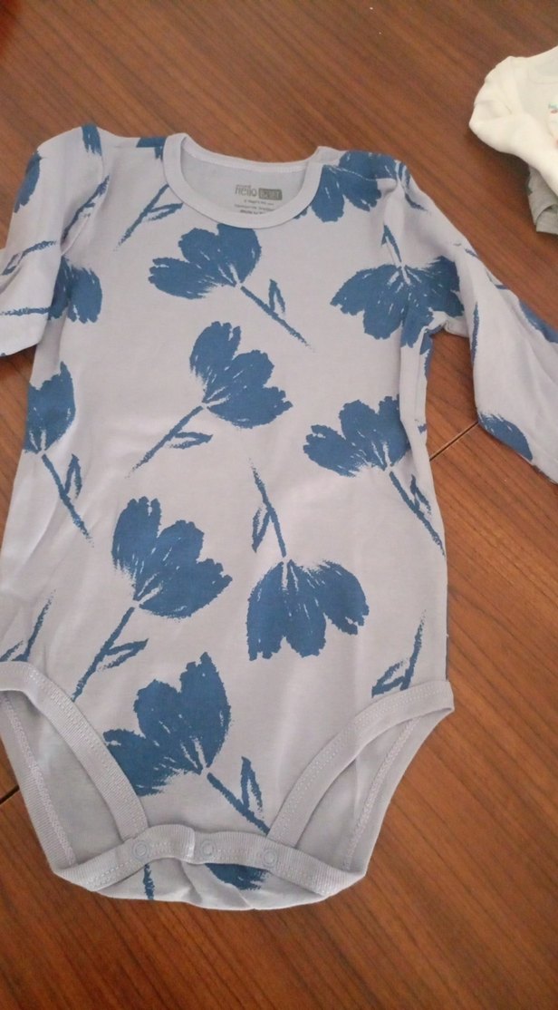Mavi renkli, uzun kollu ve yuvarlak yakalı bebek body, çiçek desenli baskıya ve kolay giydirme için düğmelere sahiptir.